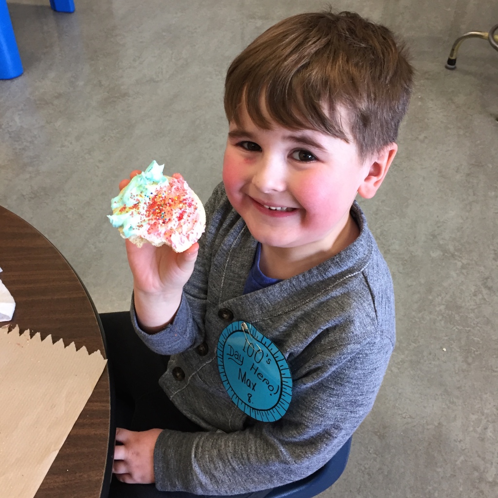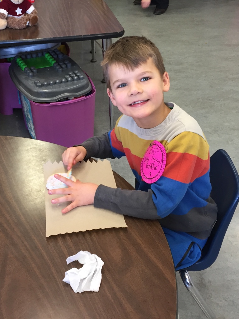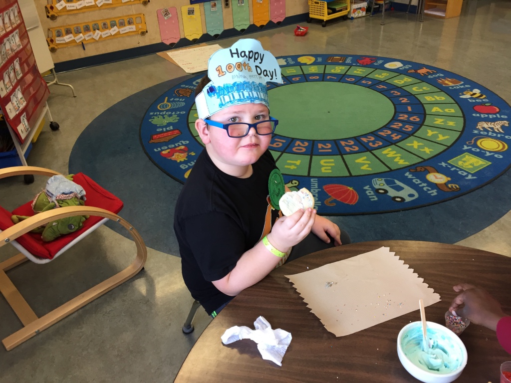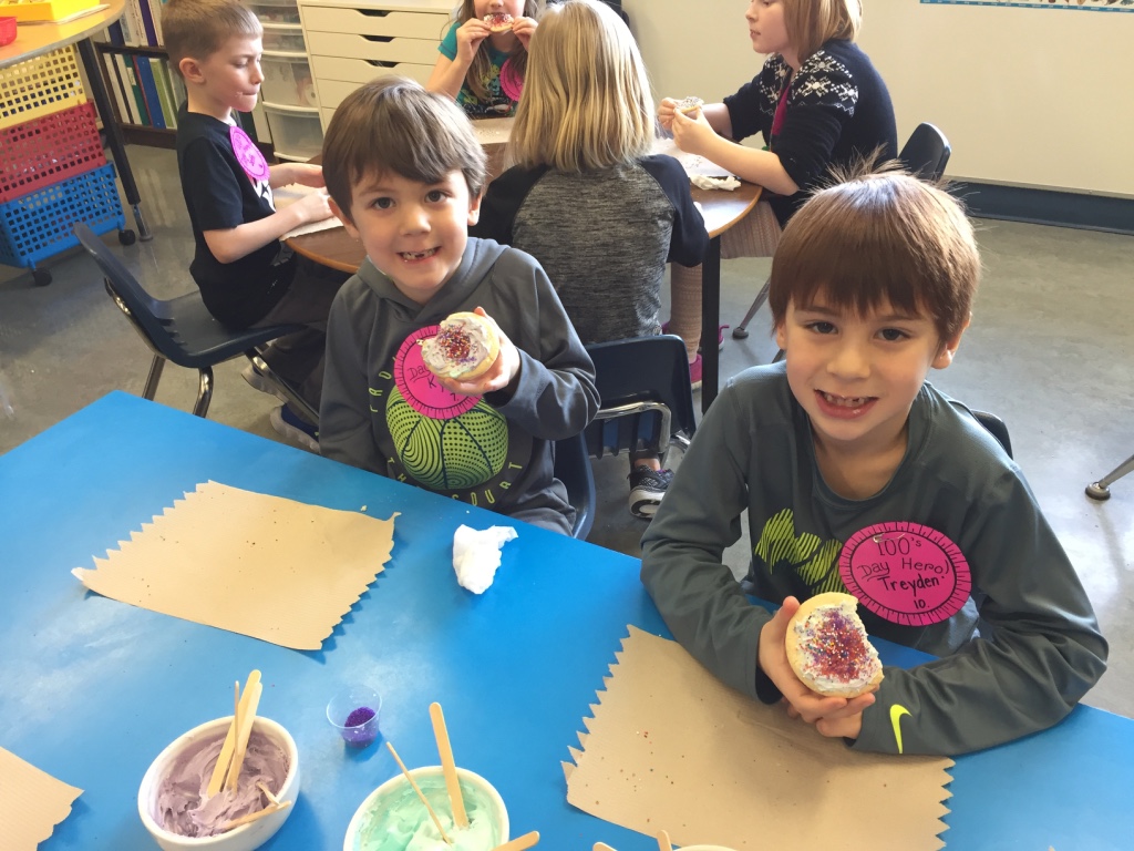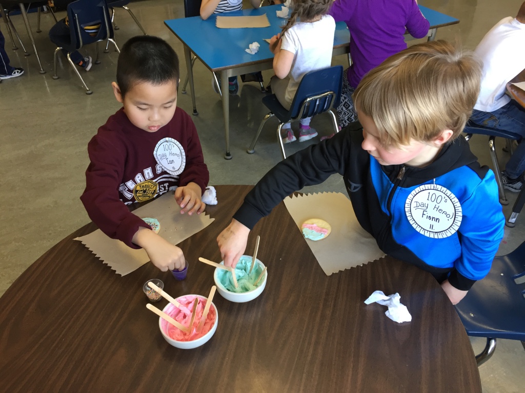 Bert Ambrose students celebrated the 100th Day of School on Friday, February 16th. Our Kindergarten to Grade 2/3 children spent the morning in their classes doing activities focused on the number 100. Our afternoon was spent with students in mixed groups as they rotated through centres involving finding and building numbers, dice games, puzzles, building, movement and a celebration centre.