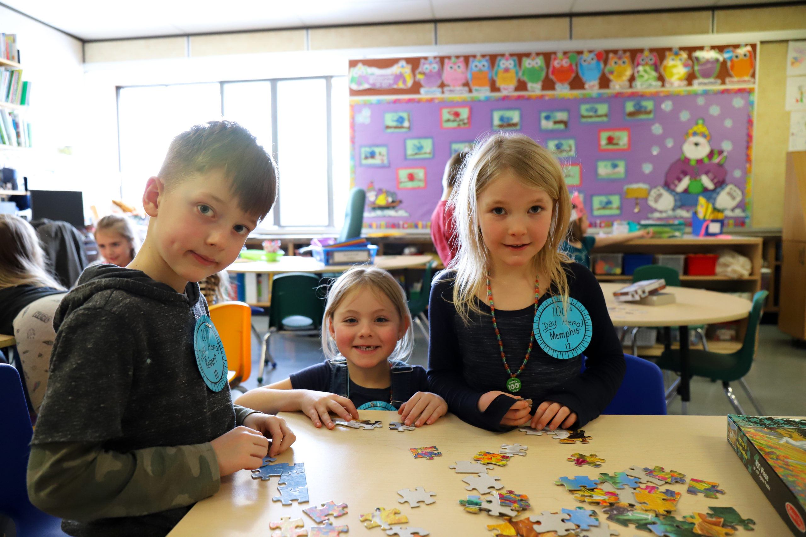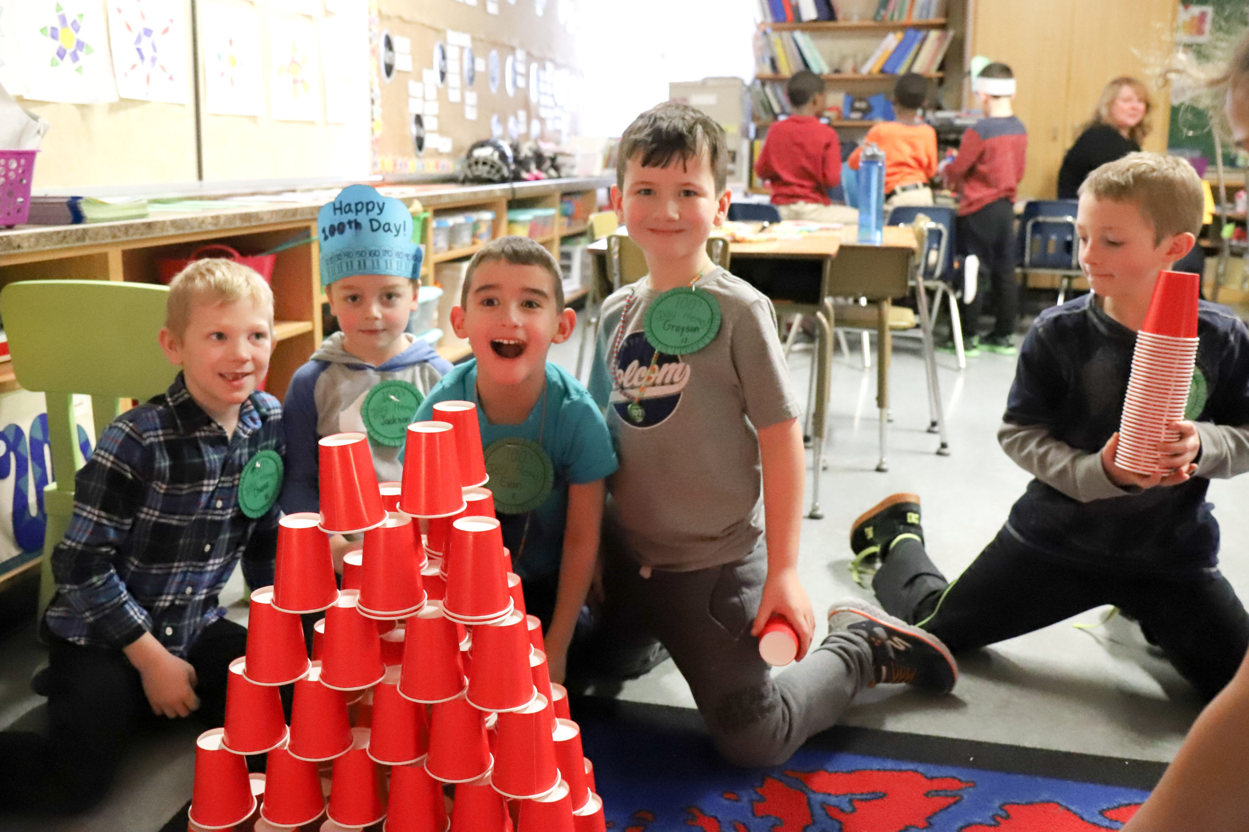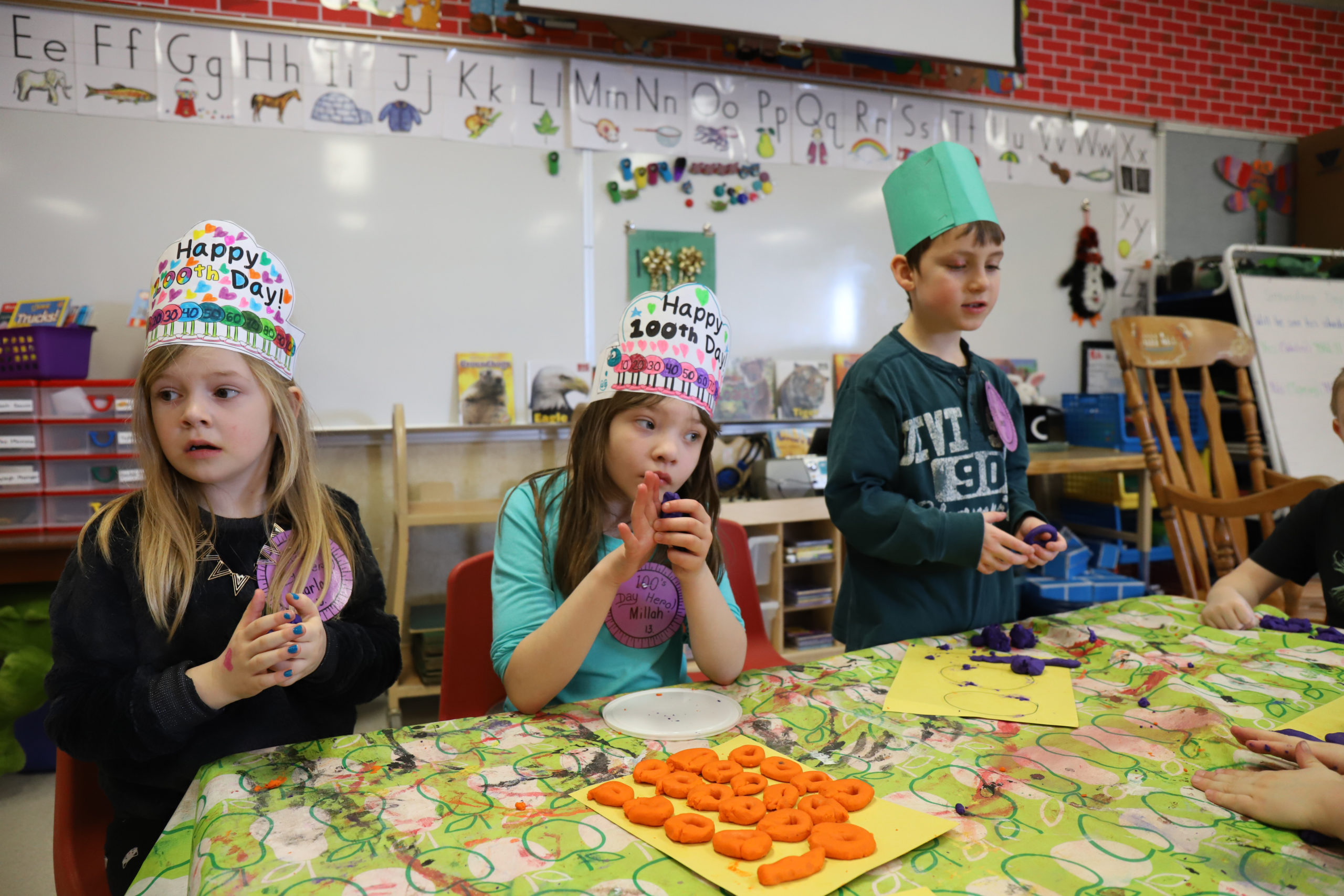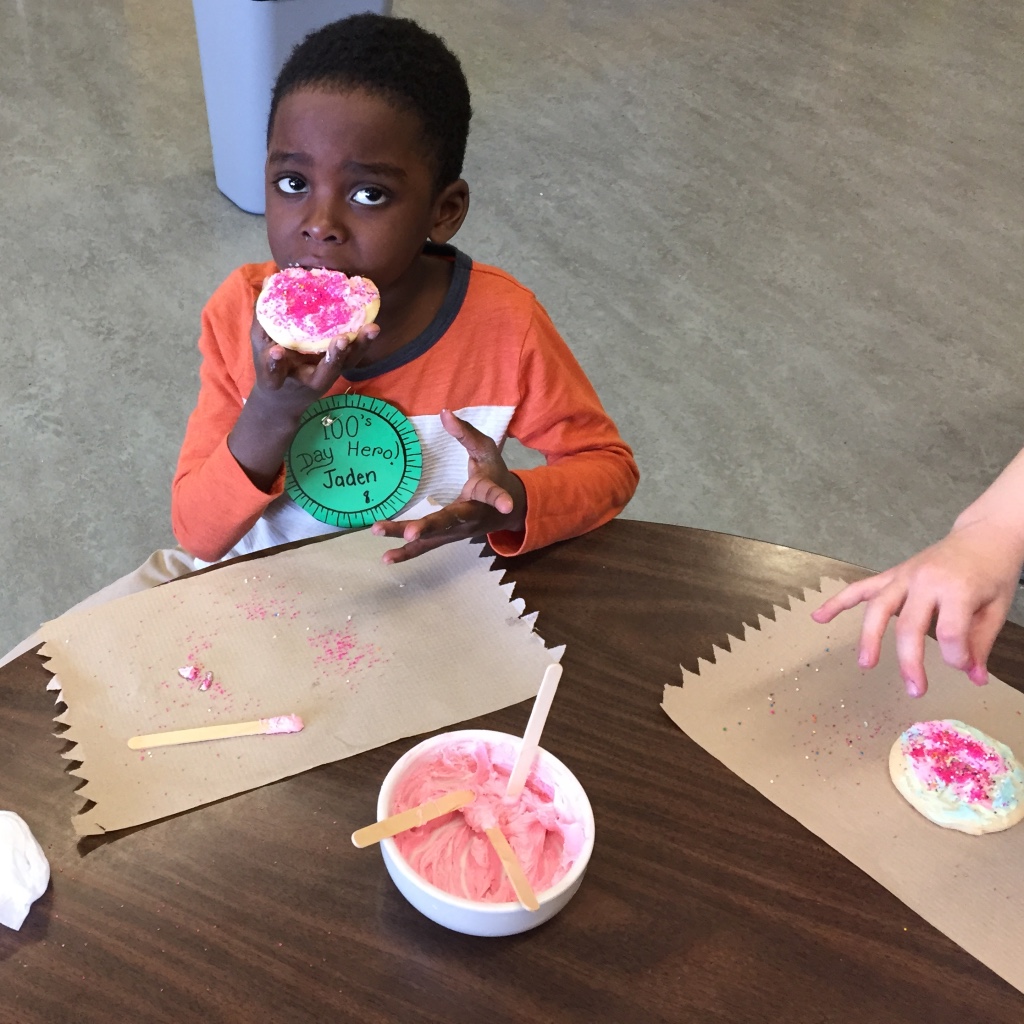 Bert Ambrose students celebrated the 100th Day of School on Friday, February 16th. Our Kindergarten to Grade 2/3 children spent the morning in their classes doing activities focused on the number 100. Our afternoon was spent with students in mixed groups as they rotated through centres involving finding and building numbers, dice games, puzzles, building, movement and a celebration centre.